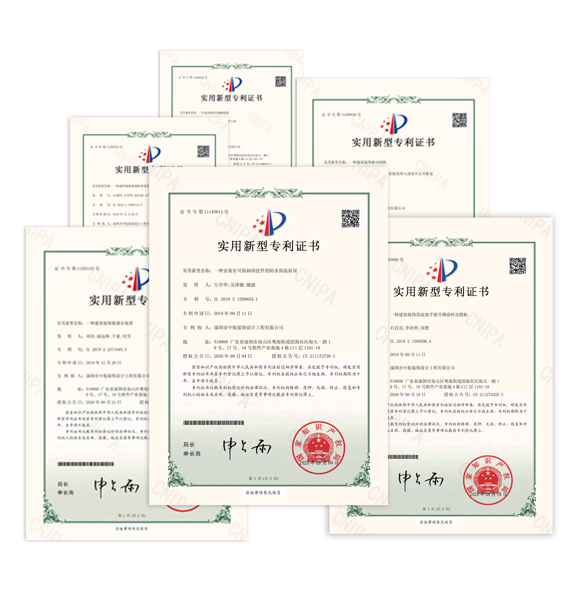 技術研發是企業的生命,也是立足市場的根本。中航裝飾一直來高度重視并鼓勵全體中航人積極創新,在工藝研發、工具研發、安全施工、綠色環保等方面進行技術改進和研發,大力提升工程質量。此次榮獲六項“實用型專利證書”,展現了中航裝飾在自主研發和產品創新方面的強大實力,有利于公司進一步完善知識產權保護體系,形成持續創新機制,提升集團核心競爭力。