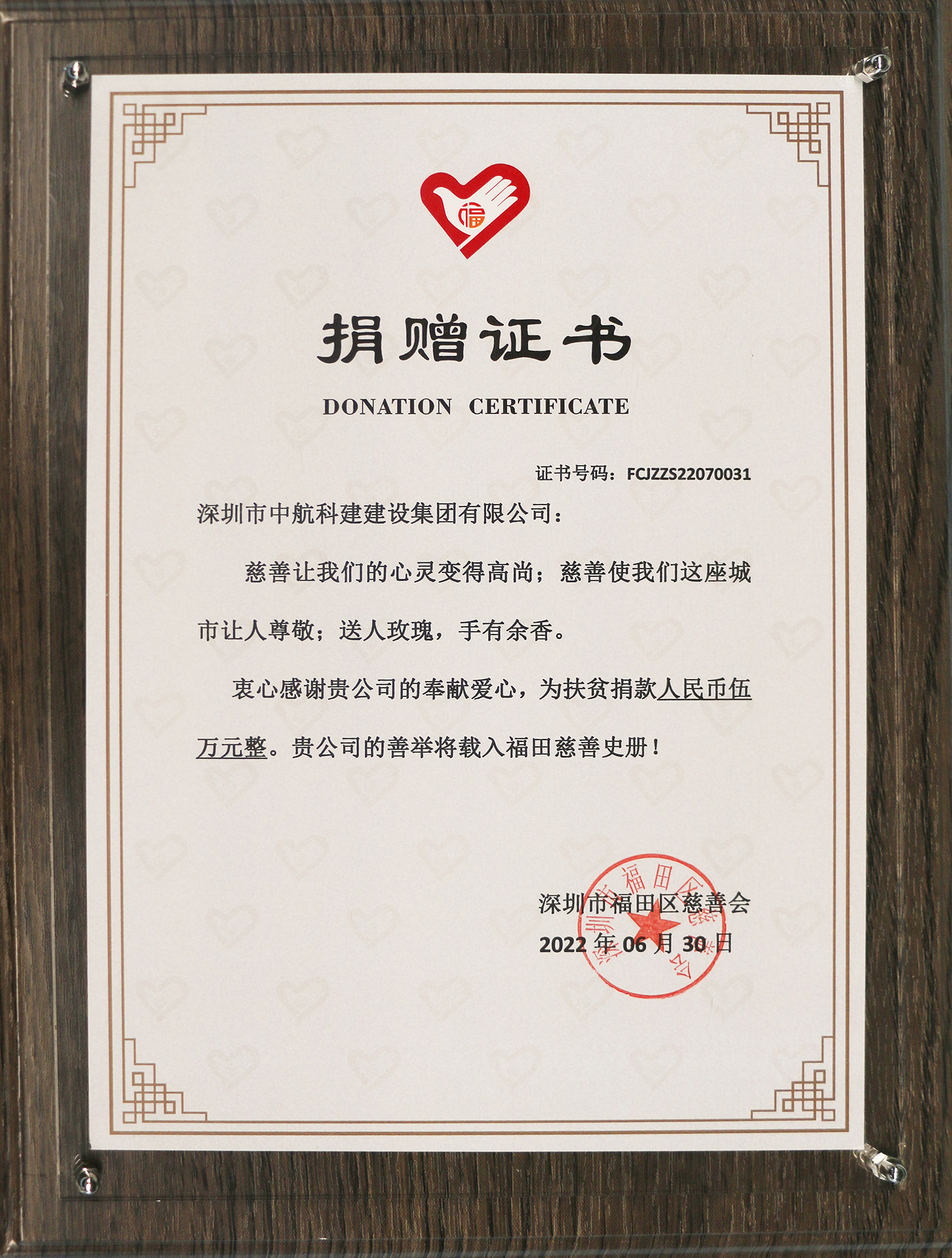 ? ? ? ?為積極響應落實黨中央、國務院精準扶貧和扶貧攻堅的指示精神,凝心聚力,為打贏脫貧攻堅戰貢獻智慧和力量,中航科建向福田區慈善會捐款五萬元,用于鄉村振興工作,鞏固脫貧成果,體現了深厚的為民情懷和高度的社會責任感。