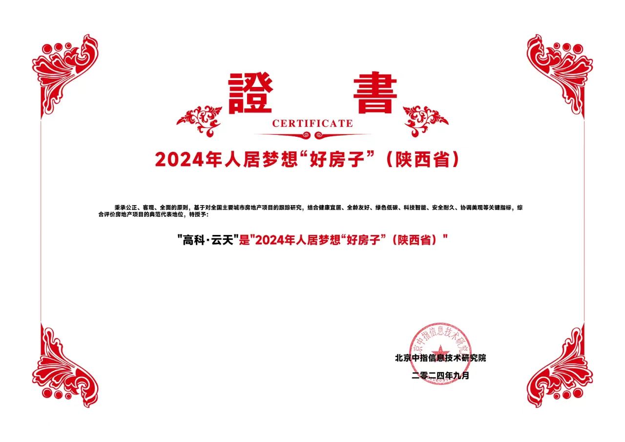 高科•云天作為西安劃時代里程碑項目,在“2024中國房地產品牌價值研究成果發布會暨第二十一屆中國房地產品牌發展論壇”,獲得了2024人居夢想“好房子”的榮譽。這是行業內的高度認可,更是高科•云天品質實力的體現。