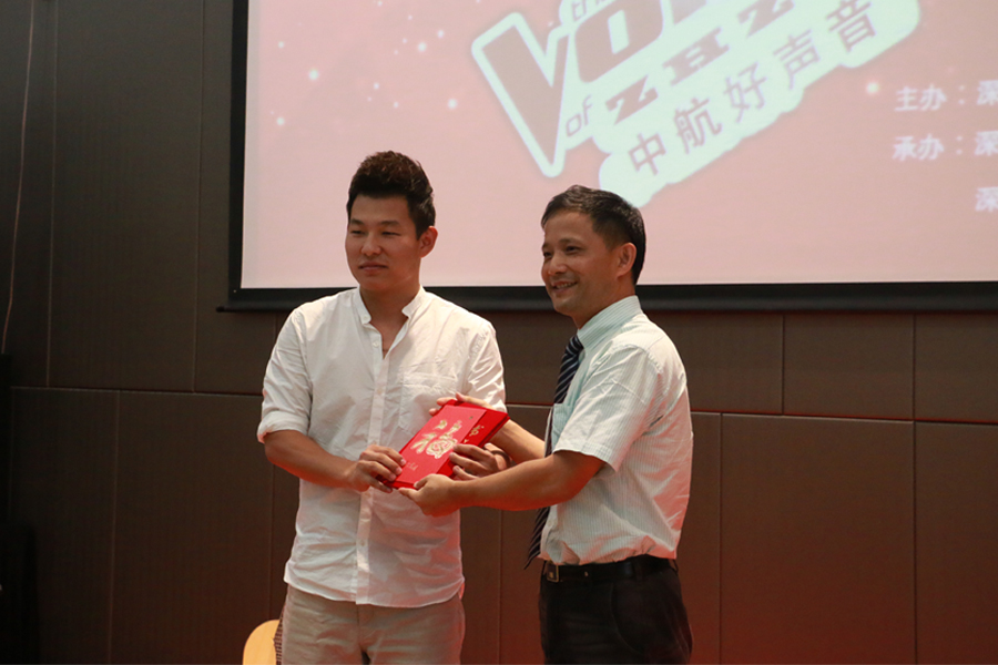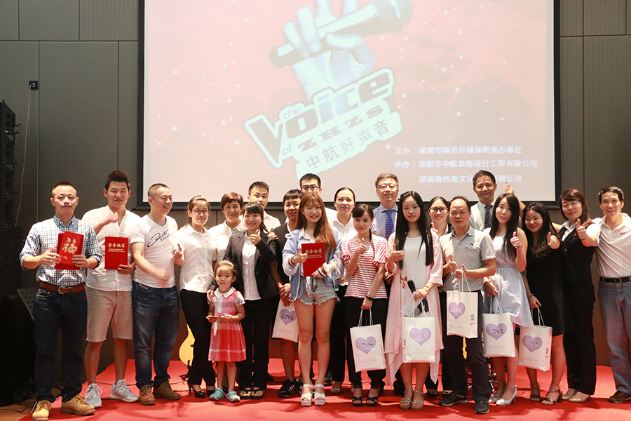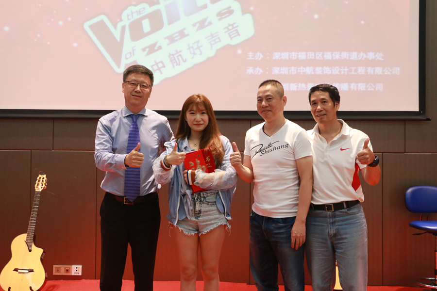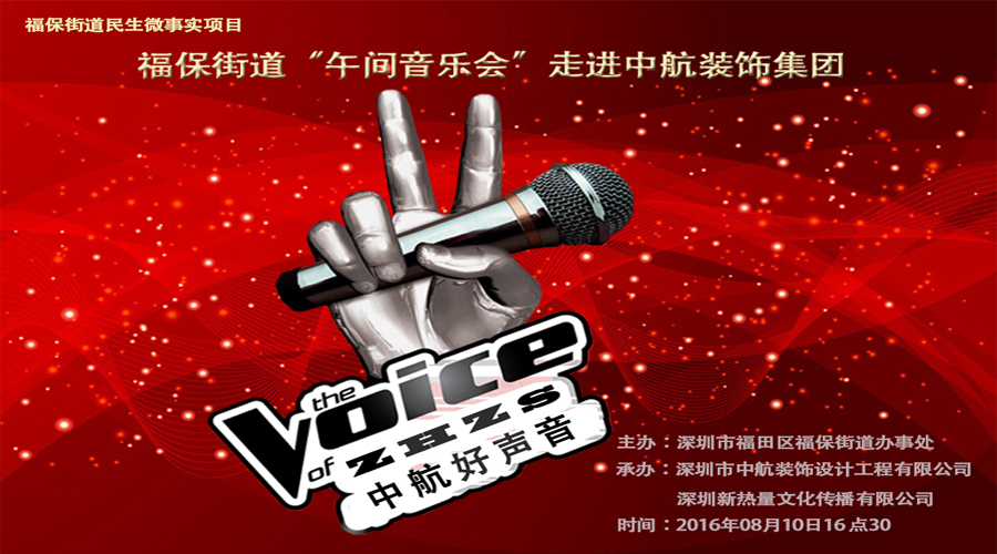 ? ??2016年8月10日,由福田區福保街道辦主辦、中航裝飾集團及深圳新熱量文化傳播有限公司承辦的“午間音樂會”暨“中航好聲音”總決賽在福田保稅區中航裝飾集團總部的多功能廳精彩上演,經過近兩個小時的激烈角逐,這一聽覺盛宴給中航裝飾的全體員工在炎炎夏日帶來了一份酣暢淋漓的享受。